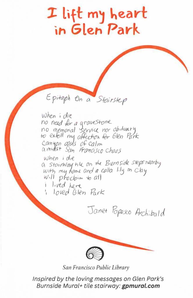 Hear ye, hear ye! Our fabulous Glen Park library branch is inviting you to express what makes you smile in Glen Park, in free verse, rhyme, haiku, or whatever style suits you. It was inspired by the … Read More... about Glen Park calls out for your inner poet!