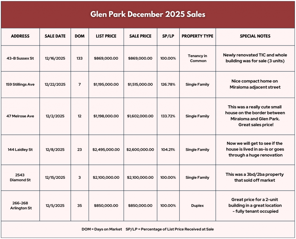 Here’s a snapshot of Glen Park and San Francisco numbers for 2025 vs 2024:
